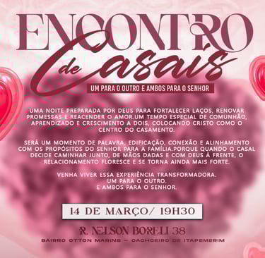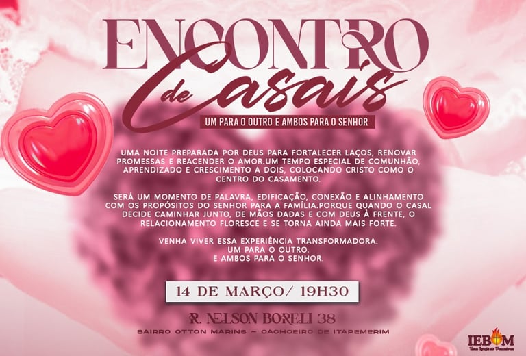 A Igreja Batista IEBOM convida todos os casais para participarem do Encontro de Casais, um momento especial preparado para fortalecer o relacionamento, renovar o amor e edificar a família segundo os princípios da Palavra de Deus.