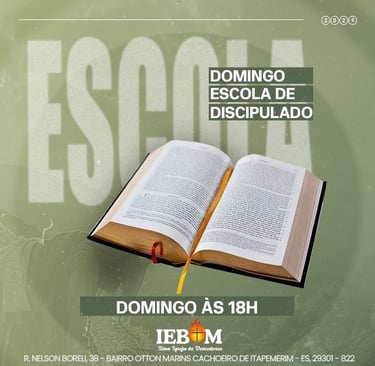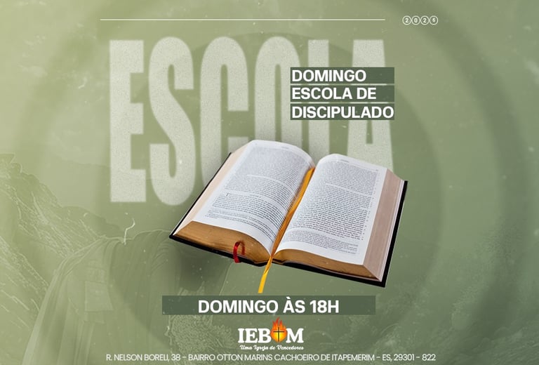 A Igreja Batista IEBOM convida você para participar da Escola de Discipulado, um tempo dedicado ao crescimento espiritual, ensino da Palavra e fortalecimento da fé.